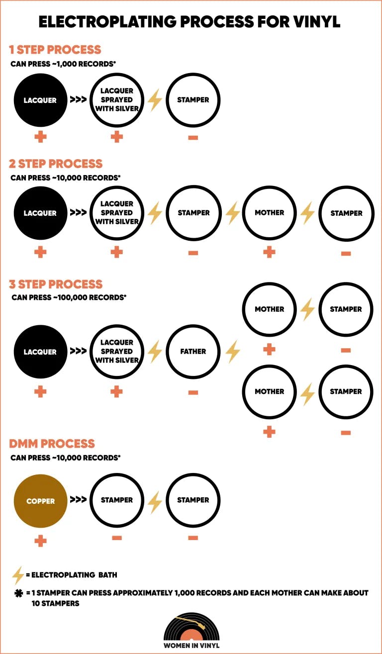Electroplating / electroforming is an essential step in the vinyl record manufacturing process; it creates the metal stampers used to press vinyl records. This process requires a combination of science, technical expertise, chemicals, and specialized equipment. This process occurs by electrochemically depositing nickel onto the master, creating a precise and uniform layer of metal. A complex process, proper electroplating ensures that the stamper is clean and accurate, so that the final vinyl record is free of defects to be enjoyed for years and represses to come. Watch these videos and download our PDF guide for the electroplating for vinyl process.
